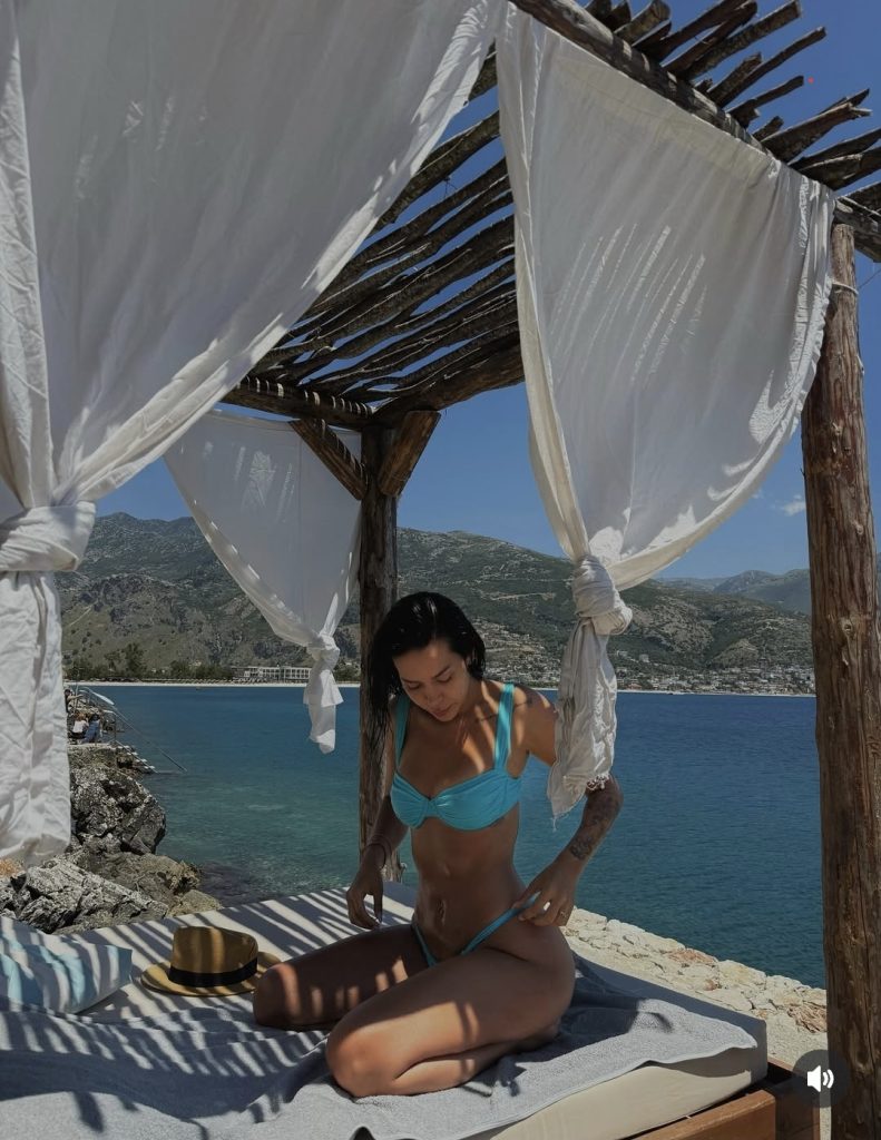 E veshur me një bikini ngjyrë të kaltër që i nxjerr në pah linjat elegante, Efi shfaqet duke ngjitur shkallët nga uji.