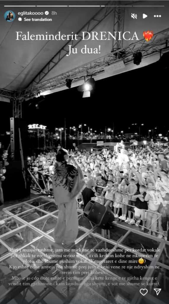 Gjatë koncertit, ajo interpretoi këngën “A vritet pafajësia” për një publik të zjarrtë, ndërsa në rrjetet sociale ndau edhe një mesazh personal për ndjekësit e saj.