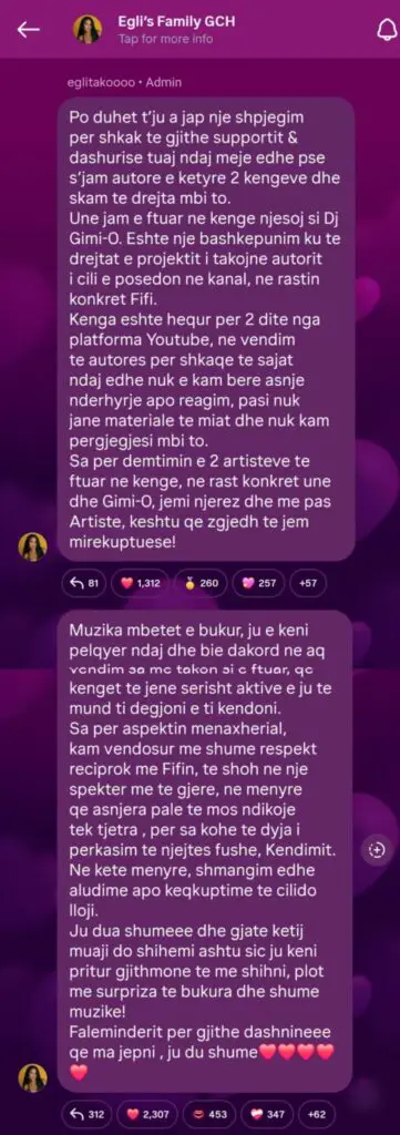 “Kënga është hequr për 2 ditë nga platforma YouTube, në vendim të autores për shkaqe të sajat, ndaj edhe nuk kam bërë asnjë ndërhyrje apo reagim, pasi nuk janë materiale të miat”, thekson Egli.