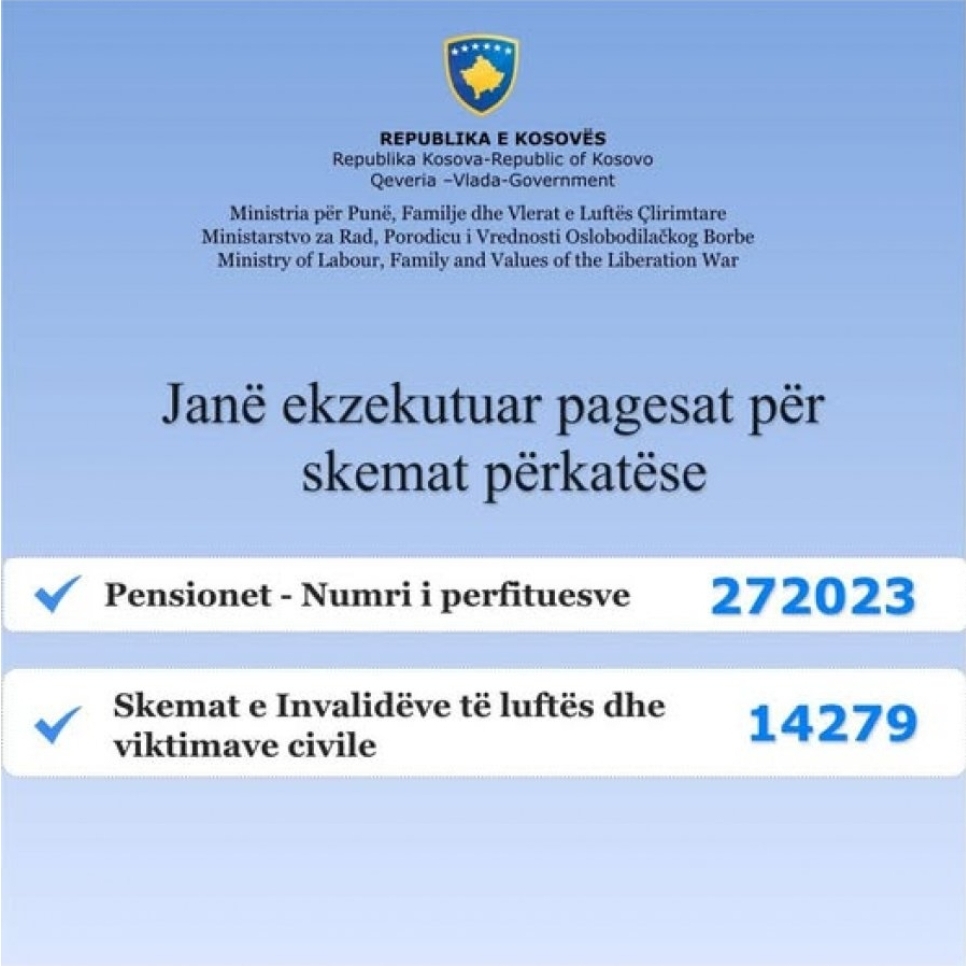 Po ashtu, Ministria ka bërë të ditur se janë alokuar edhe pensionet për skemat e invalidëve të luftës dhe viktimave civile, me gjithsej 14.279 përfitues.