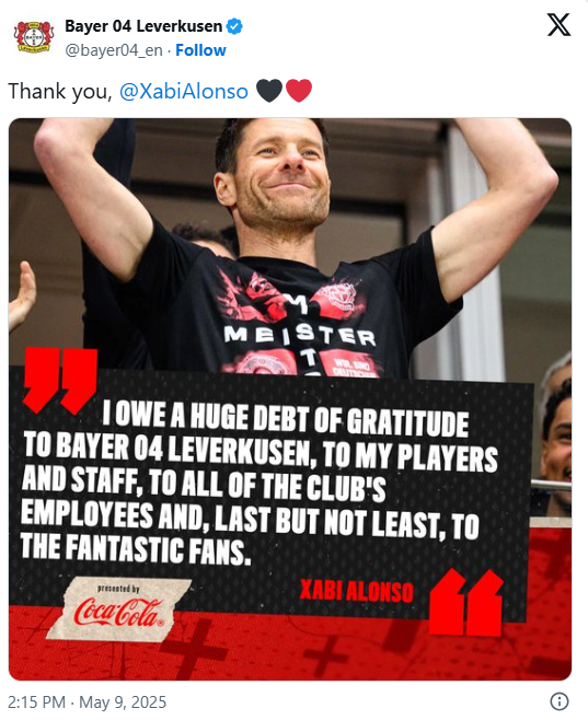 “Jam thellësisht mirënjohës ndaj Bayer Leverkusen, lojtarëve dhe stafit tim, të gjithë punonjësve të klubit dhe, në fund por jo më pak të rëndësishëm, tifozëve të mrekullueshëm”, ka thënë fillimisht Alonso pas vendimit për largim.