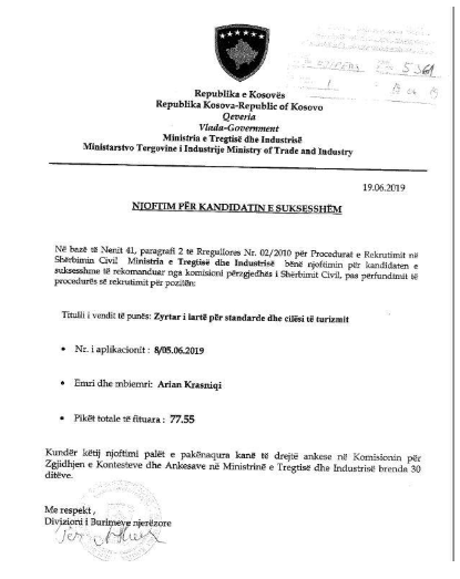Sipas rezultatit të konkursit, ai ka fituar 77.55 pikë, ndërkohë nuk dihet sa persona kanë garuar për këtë pozitë. Por, nëse gjithçka do të shkojë mirë, pas 30 ditëve këshilltari politik i Shalës do të jetë nëpunës i karrierës (përhershëm).