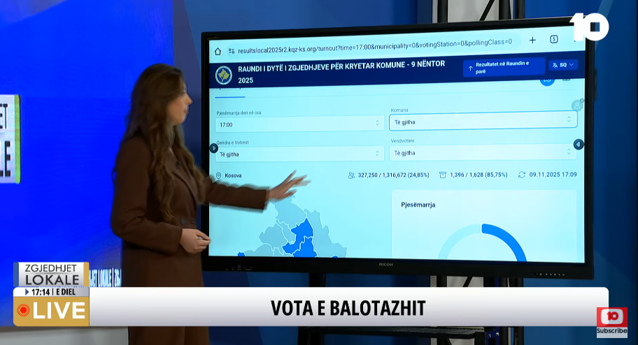 Exit Polli në emisionin Pressing në T7 tashmë ka publikuar matjet e veta për zgjedhjet e sotme të zhvilluara në Kosovë për kryetarë të 18 komunave, si pjesë e raundit të dytë.Pjesë e këtyre matjeve është edhe komuna e Gjilanit, ku në balotazh janë Alban Hyseni nga VV dhe Arbër Ismajli nga LDKAtje, sipas matjeve, Hyseni i VV i ka marrë 58.6%  %