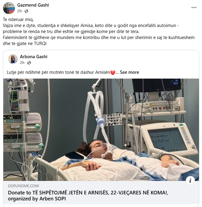 “Te nderuar miq, Vajza ime e dyte, studentja e shkelqyer Arnisa, keto dite u godit nga encefaliti autoimun – probleme te renda ne tru dhe eshte ne gjendje kome per dite te tera. Faleminderit te gjitheve qe mundeni me kontribu dhe me u lut per sherimin e saj te kushtueshem dhe te gjate ne TURQI”, shkroi babai i saj.