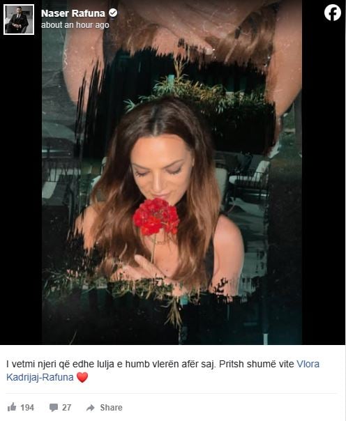 Në postimin e tij në rrjetet sociale, Naser Rafuna ka shkruar se afër bashkëshortes së tij, Vlorës, gjithçka bëhet më e bukur dhe e rëndësishme.