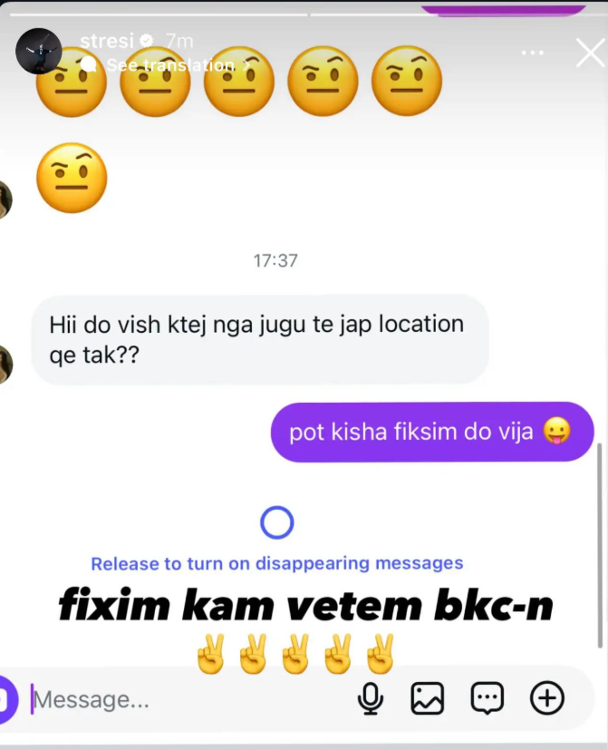 Stresi ka ndezur rrjetin me një story të fundit në Instagram, ku ndan një bisedë private me dikë që i propozon një takim në jug.