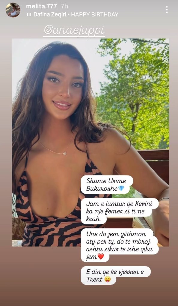 “Shumë urime bukuroshes. Jam e lumtur që Kevini ka një femër si ti në krah. Unë do jem gjithmonë aty për ty, do të mbroj ashtu sikur të ishe çika jem. E din që ke vjehrrën e Trent,” ka shkruar Melita krahas një fotografie të Anës.