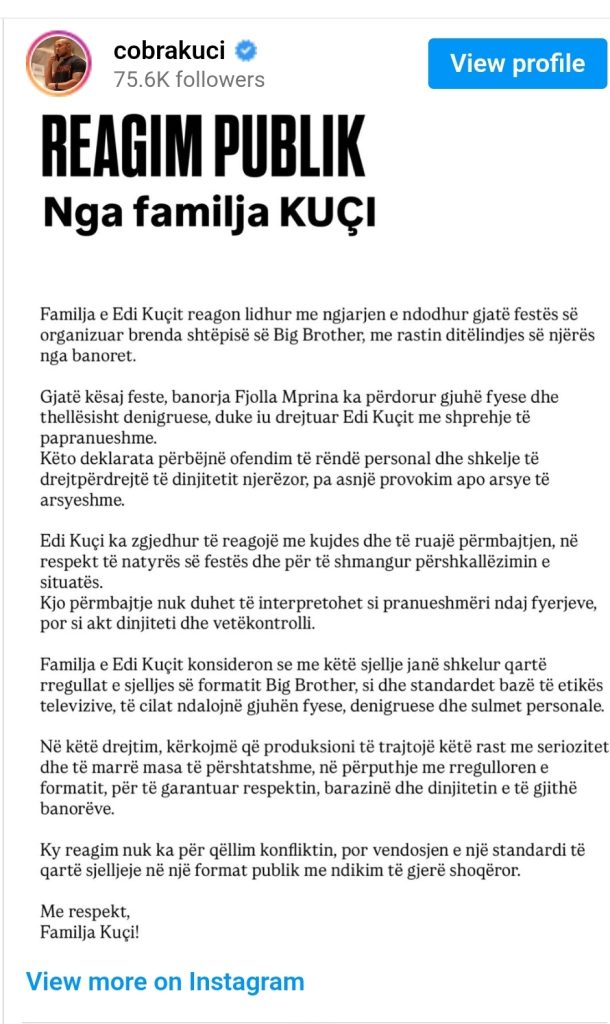 Familja e Eduard Kuçit ka reaguar publikisht në rrjete sociale lidhur me një ngjarje të ndodhur gjatë një feste brenda shtëpisë së Big Brother VIP, e organizuar me rastin e ditëlindjes së Dolces.