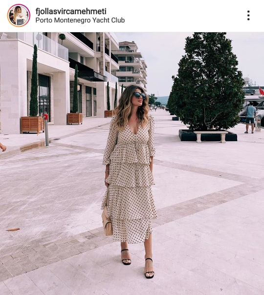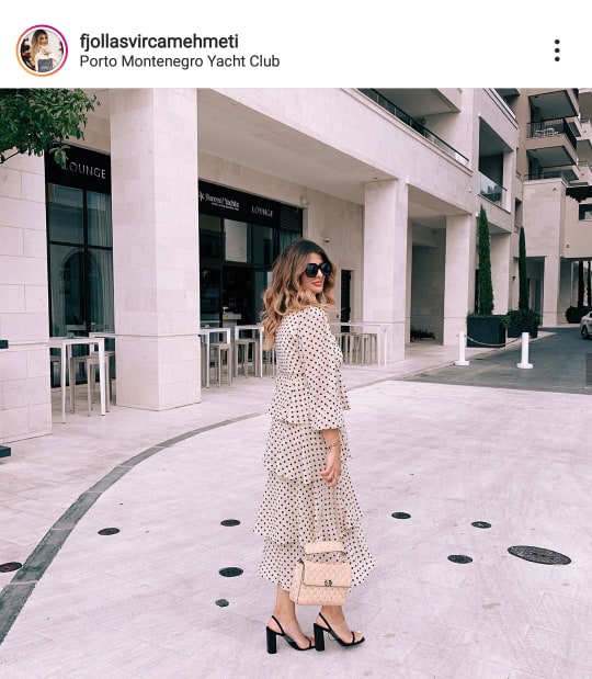 Në disa foto të publikuara, Fjolla shfaqet e veshur me fustan të gjatë e kobinuar mirë me sandale e çantë, ajo po duket një zonjë e verëtë. /ORAinfo/