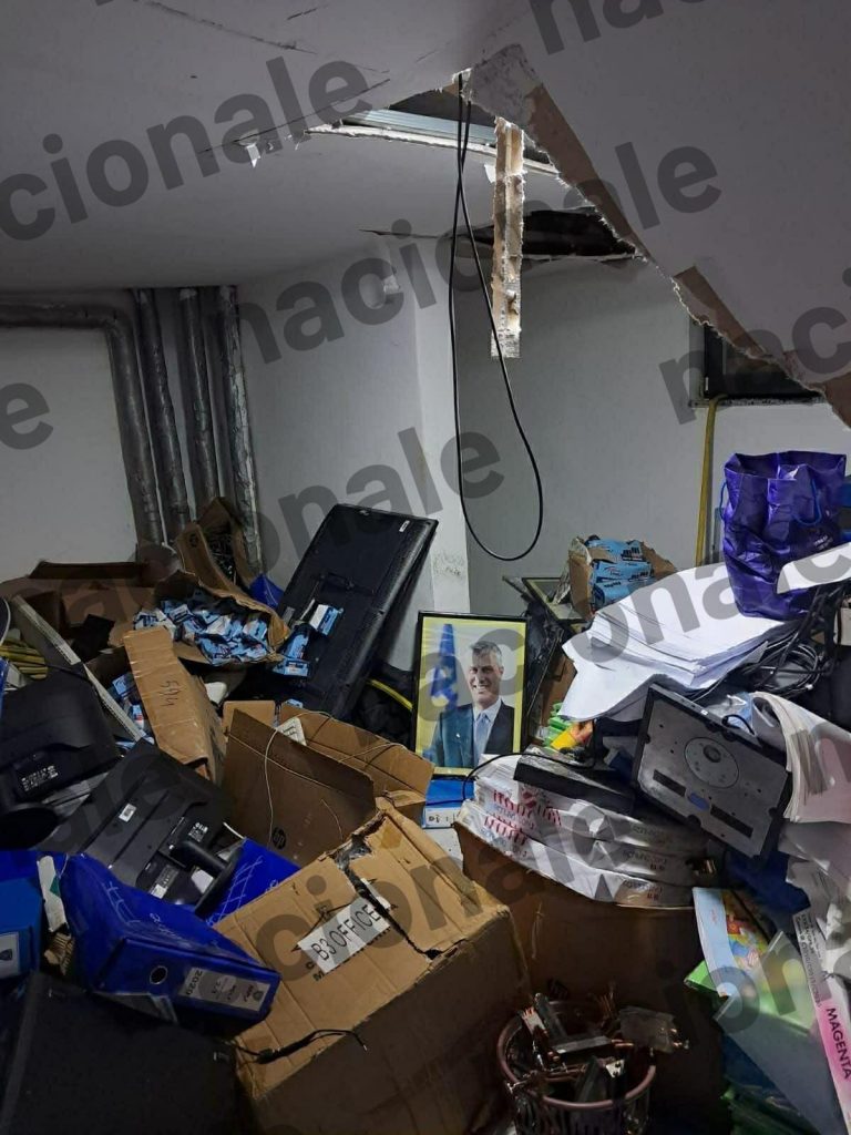 Në fotografinë e siguruar nga Nacionale, shihet se imazhi i Thaçit është vendosur në bodrum, skaj shumë dokumenteve, televizorëve, letrave e dosjeve të cilat janë të papërdorshme.