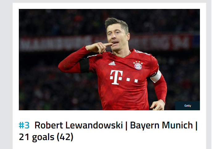 Robert Leëandoëski i Bayern Munich e përmbyll top treshen me 21 gola apo 42 pikë.