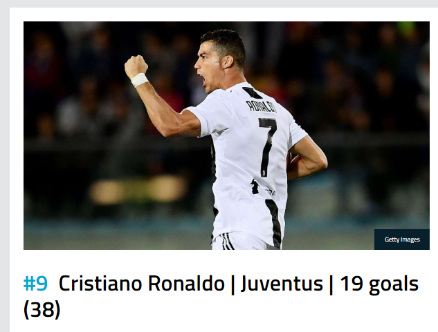 Cristiano Ronaldo, që tani luan me Juventusin në Serie A, ngel shumë mbrapa dhe praktikisht pa asnjë gjasë për të triumfuar, në vendin e nëntë me 19 gola apo 38 pikë.
