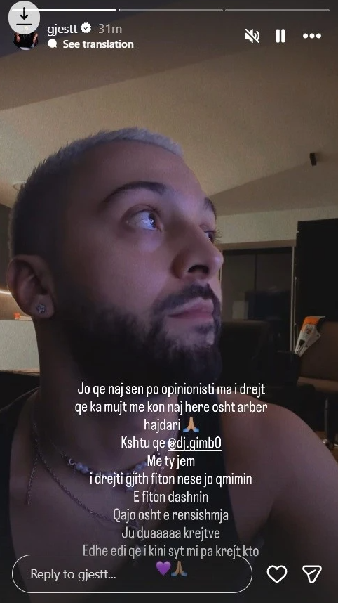 “Jo që najsend po opinionisti më i drejt që ka mundur të jetë ndonjëherë është Arbër Hajdari, kështu që DJ Gimbo me ty jemi, i drejti gjithë fiton, nëse jo çmimin, e fiton dashurinë. Qajo është e rëndësishmja. Ju duaaaaa krejtve. Edhe e di që i keni sytë me i pa krejt këto”, ka shkruar Gjesti.
