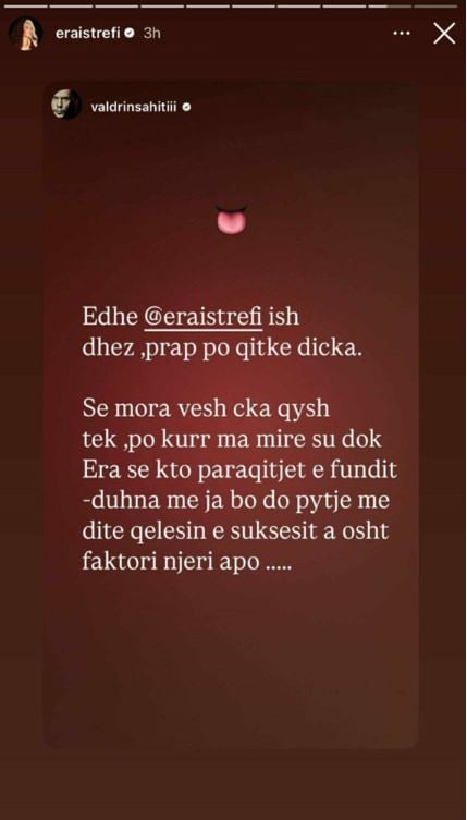 Në postimin e tij, Valdrin shpreh entuziazmin dhe kënaqësinë e tij për rikthimin e Erës në skenë, duke theksuar se ajo po shkëlqen me një stil dhe një prezencë të re, më të fuqishme se kurrë më parë. Ai përdor një gjuhë shumë të drejtpërdrejtë dhe të gjallë, duke thënë: “Edhe Era Istrefi ish dhez, prap po qitke diçka,” duke iu referuar faktit që Era, megjithëse ka qenë gjithmonë një figurë e spikatur në industrinë muzikore, tashmë po vjen me një energji dhe stil që e bën atë të duket krejt ndryshe dhe më e plotë.