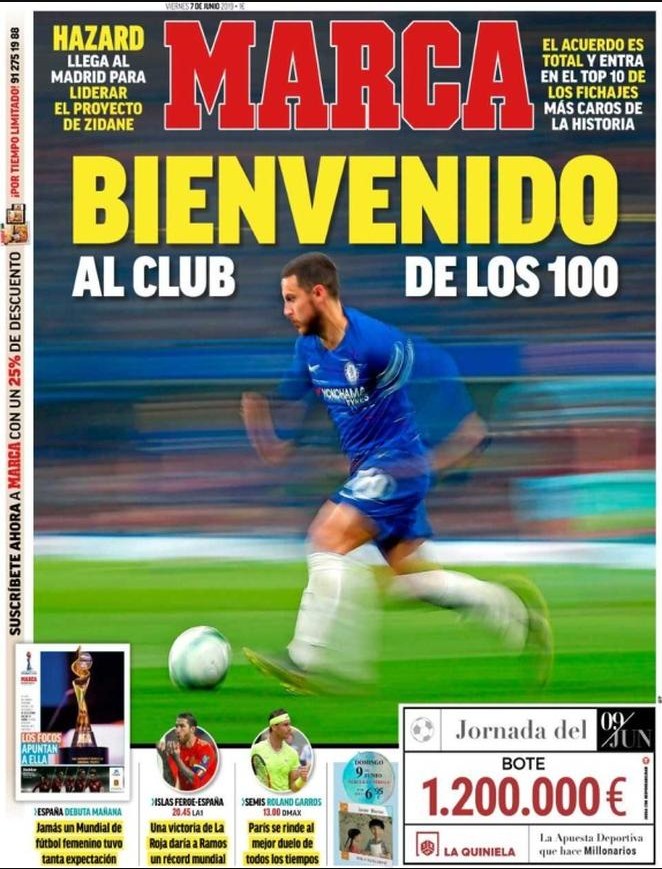 Gazeta spanjolle Marca ka mirëpritur yllin e Chelseat Eden Hazard te Real Madridi me një mesazh të veçantë në faqen e parë të tij.