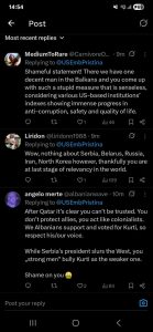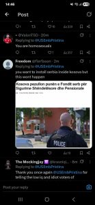 “Ju dëshironi që ta instaloni Serbinë brenda Kosovës, por kjo nuk do të ndodhë”, shkroi dikush me emrin abstrakt “Freedom”.
