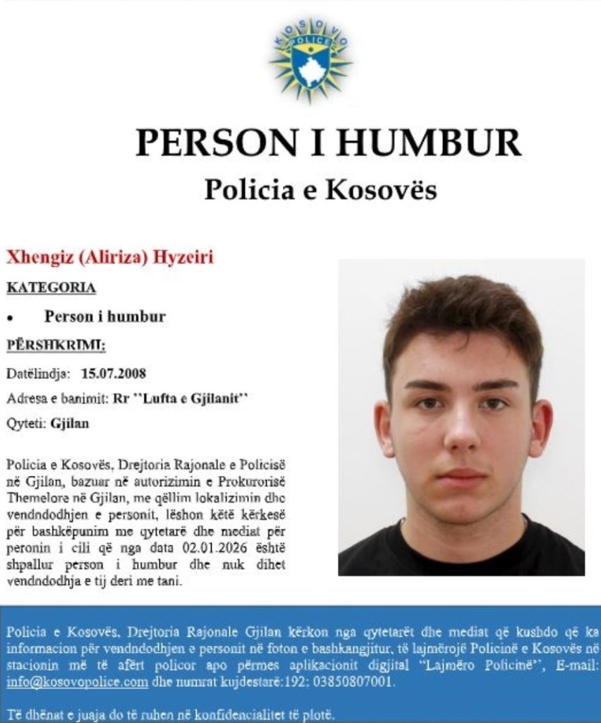 “Policia e Kosovës, Drejtoria Rajonale e Policisë në Gjilan, bazuar në autorizimin e Prokurorisë Themelore në Gjilan, me qëllim lokalizimin dhe vendndodhjen e personit, lëshon këtë kërkesë për bashkëpunim me qytetarë dhe mediat për personin i cili që nga data 02.01.2026 është shpallur person i humbur dhe nuk dihet vendndodhja e tij deri me tani”, thuhet në njoftim.