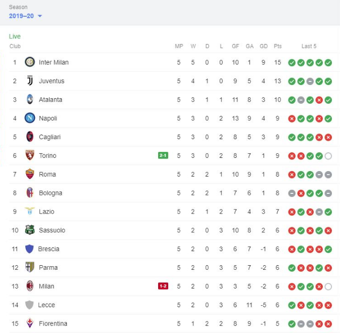 Në anën tjetër, Torino ngjitet në vendin e gjashtë me 9 pikë, ndërsa tabelës i prin Inter me pikë të plota pas 5 ndeshjeve, 15 gjithsej.