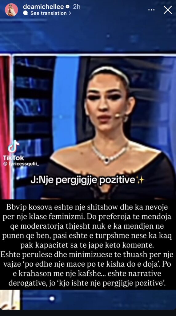 Megjithatë, reagimi i Jonidës nuk i shpëtoi ironisë së influencueses Dea Mishel, e cila përmes një postimi ka komentuar situatën me nota ironike, duke shtuar më tej debatet dhe diskutimet mes ndjekësve të formatit.