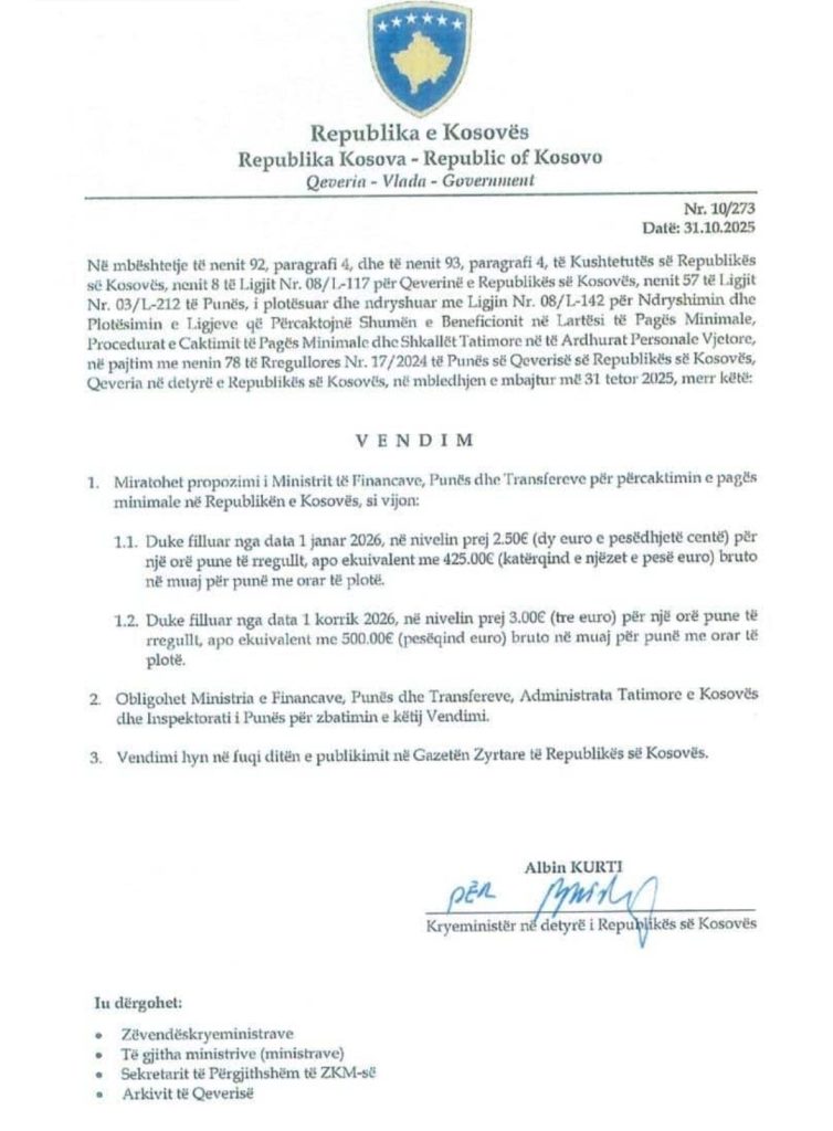 Sipas vendimit zyrtar me numër 10/273, të datës 31 tetor 2025, i nënshkruar nga kryeministri në detyrë Albin Kurti, paga minimale do të jetë: 425 euro bruto duke filluar nga 1 janari 2026, për një punë të rregullt me orar të plotë dhe 500 euro bruto duke filluar nga 1 korriku 2026, po ashtu për punë të rregullt me orar të plotë.