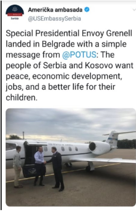 Grenell ateron me aeroplan special në Beograd, përcjell fjalët e Trump.