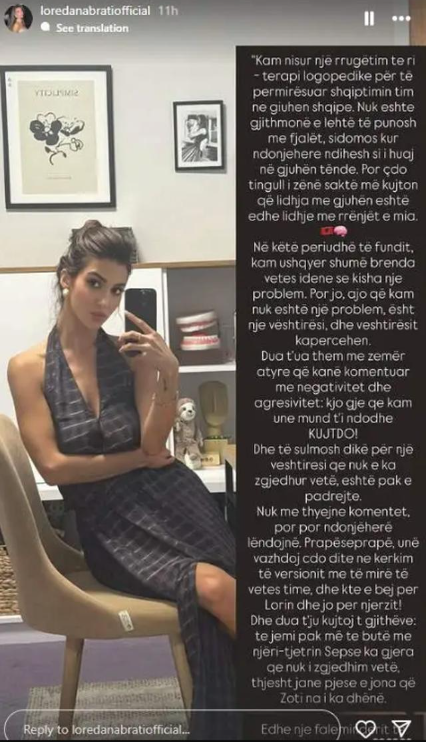 Përmes një postimi të sinqertë në rrjetet sociale, Loredana ka bërë të ditur se ka filluar një proces të ri zhvillimi personal: terapia logopedike, me qëllim përmirësimin e shqiptimit të gjuhës shqipe.