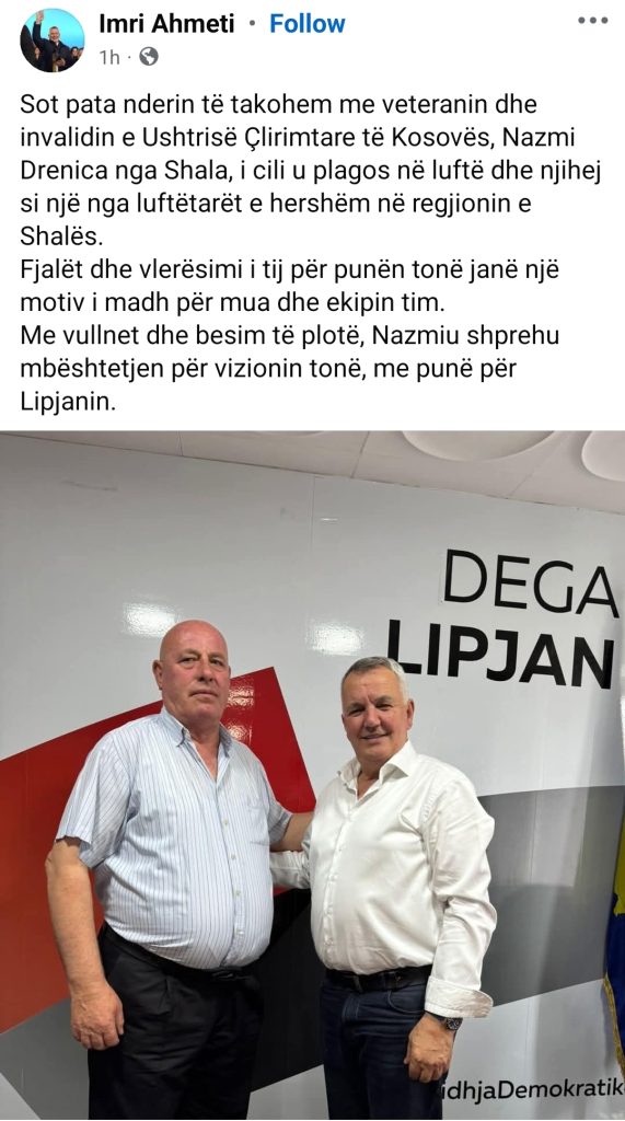 Kryetari i Komunës së Lipjanit, Imri Ahmeti, sot ka zhvilluar një takim të veçantë me veteranin dhe invalidin e Ushtrisë Çlirimtare të Kosovës, Nazmi Drenica nga Shala.