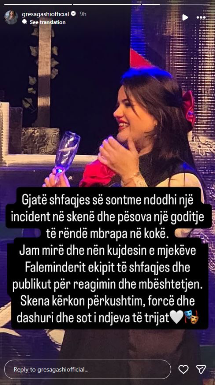 Përmes një reagimi në rrjetet sociale, vetë Gresa ka bërë të ditur se ka pësuar një goditje të fortë në pjesën e pasme të kokës. Ajo ka postuar një foto nga shfaqja, duke shpjeguar situatën që ka shkaktuar jo pak shqetësim.