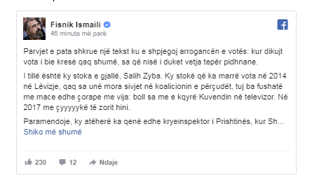 Në një shkrim të gjatë ku përdorë edhe shprehje banale, ismaili ndër të tjera tha se Sali Zyba ka qenë njëra ndër arsyet kryesore për ndarjen e Vetëvendosjes.