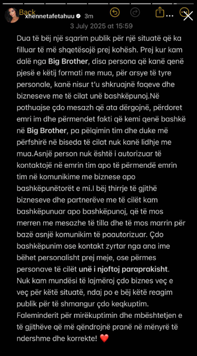 Në një postim të gjatë dhe të drejtpërdrejtë në profilin e saj zyrtar në Instagram, Xheneta ka zbuluar se prej disa kohësh ka marrë informacione të përsëritura se disa prej ish-konkurrentëve të Big Brother VIP Kosova janë duke kontaktuar në mënyrë të drejtpërdrejtë me bizneset dhe markat me të cilat ajo aktualisht bashkëpunon në kuadër të projekteve të saj si influencuese dhe figurë publike.