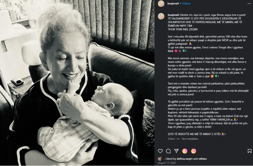 Në një periudhë që duhej të ishte e mbushur me emocione të mëdha dhe gëzim familjar, ndjekësit e Dafina Zeqirit kanë vënë re një detaj që nuk ka kaluar pa u komentuar: mungesën e nënës së saj, Melihate Zeqiri, në rrjete sociale në lidhje me lindjen e nipit të saj të sapoardhur në jetë.