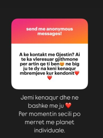Me këtë përgjigje, Tiri bëri të ditur se, ndonëse momentet e përbashkëta me Gjestin brenda shtëpisë kanë qenë të veçanta dhe argëtuese për publikun, lidhja e tyre nuk është duke u kultivuar në mënyrë aktive pas përfundimit të spektaklit.