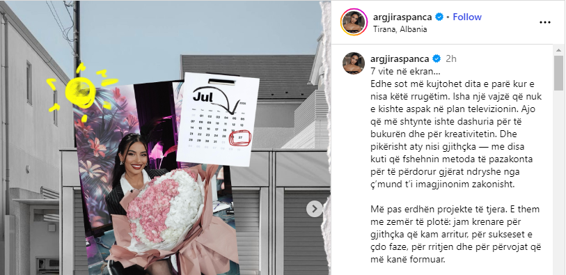 Në një postim të gjatë dhe të ndjerë në llogarinë e saj zyrtare në Instagram, moderatorja e njohur ka njoftuar se do të largohet nga programi i njohur i së dielës, “E Diell”, një nga prodhimet më të mëdha dhe më jetëgjata të Top Channel, ku ajo ka qenë pjesë e pandashme për plot shtatë vite radhazi.