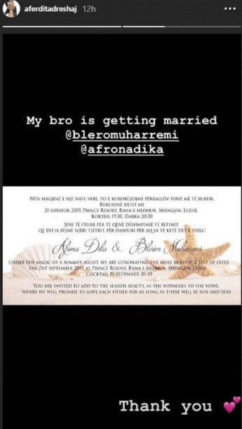 Ajo i ka uruar në rrjete sociale, mirëpo nga Londra, ani pse ditë më parë e publikoi ftesën dhe ishte e gëzuar që çifti e kanë ftuar në dasmë andaj i ka falënderuar edhe publikisht.