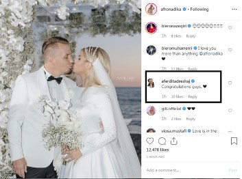 Këngëtarja dhe modelja shqiptare, Afërdita Dreshaj, ishte e ftuar po ashtu në dasmën e Bleros dhe Afronës, shkruan lajmi net.