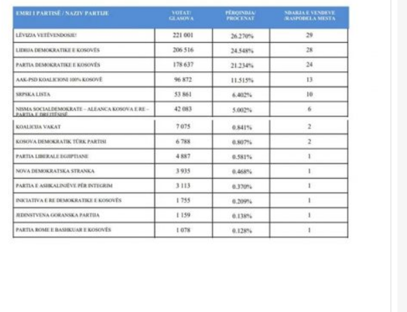 Nga ky rezultat është bërë e ditur se partia fituese e zgjedhjeve, Lëvizja Vetëvendosje do t’i ketë 29 deputetë në Kuvendin e Kosovës, LDK do të ketë 28, PDK 24, AAK-PSD 13, “Srpska” 10 dhe koalicioni NISMA-AKR-PD 6 deputetë, shkruan Gazeta Express