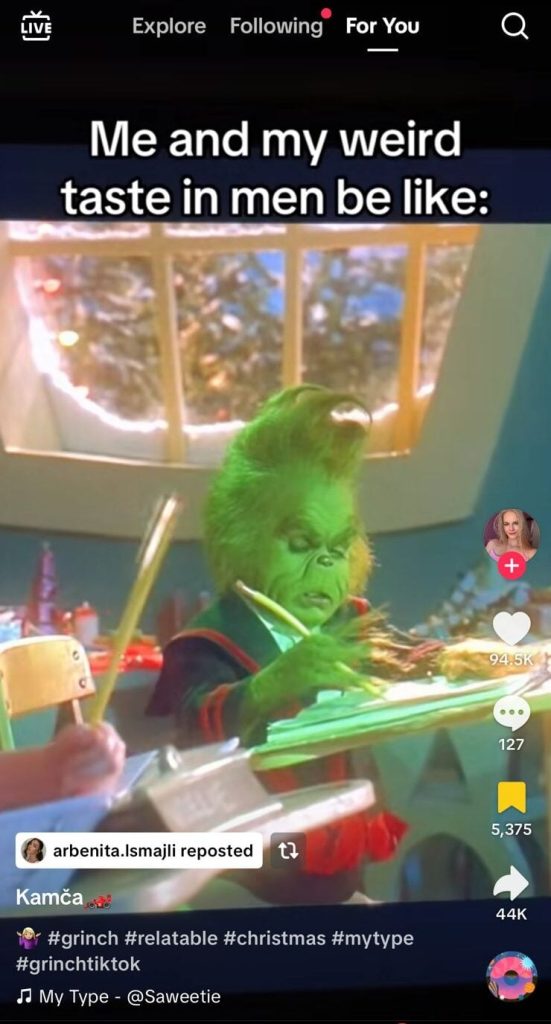 Në video, përveç shfaqjes së Grinçit, është përfshirë edhe kënga “My Type”, një hit i njohur që ka shpërthyer në rrjetet sociale, duke e bërë përmbajtjen edhe më tërheqëse dhe tërheqëse për ata që e ndjekin.