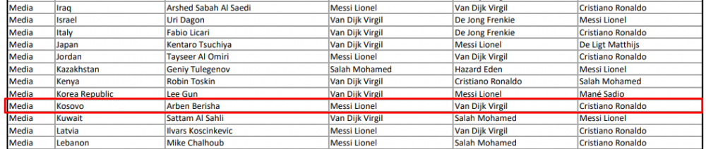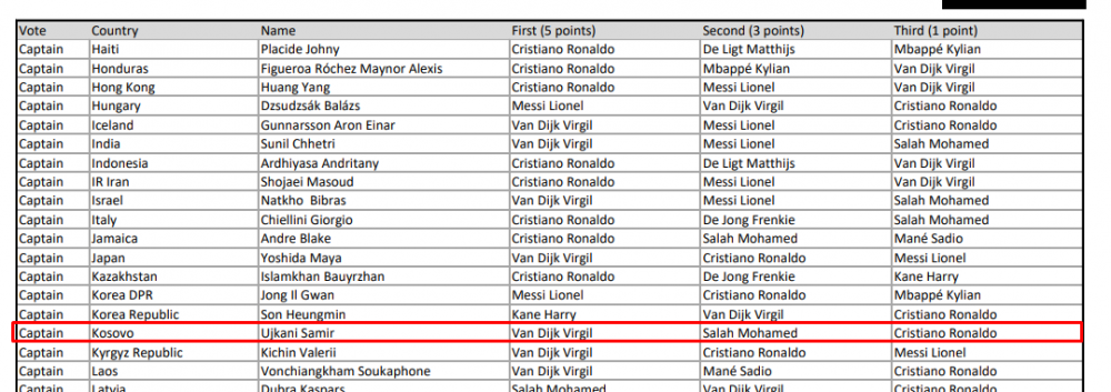 Kapiteni i Kosovës, Samir Ujkani, e ka vlerësuar në vend të parë Virgil Van Dijkun e Liverpoolit, në vend të dytë Mohamed Salahun e Liverpoolit e në vend të tretë Cristiano Ronaldon.