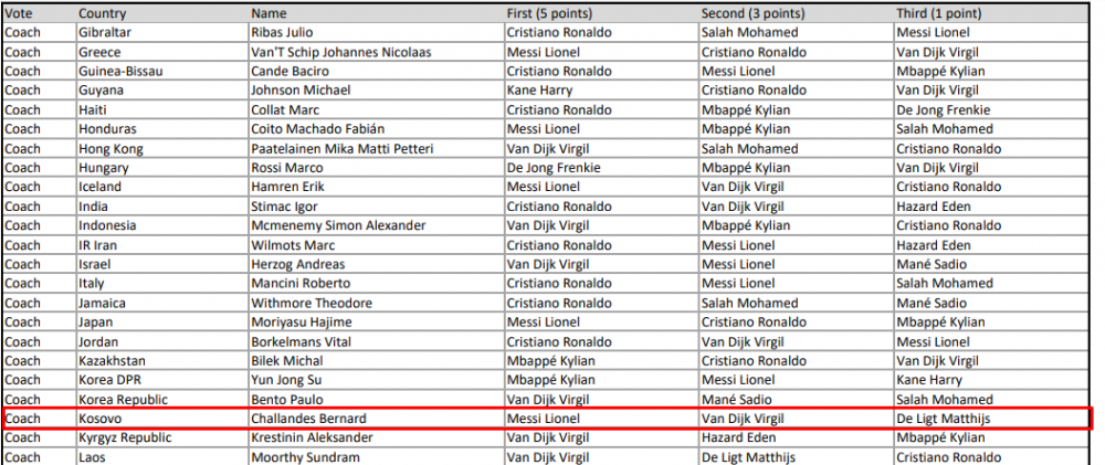 Janë publikuar edhe votat e përzgjedhësve të kombëtareve, kapitenëve e gazetarëve, në kuadër të çmimit për futbollistin më të mirë të vitit 2019.