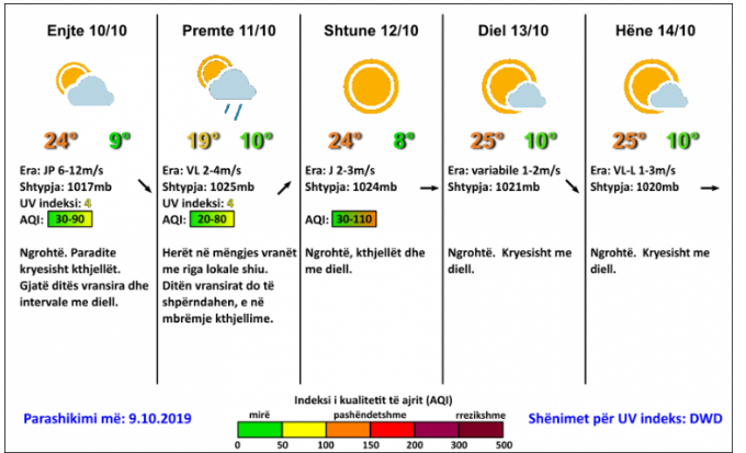 10.10 – Ngrohtë. Paradite kryesisht kthjellët. Gjatë ditës vranësira dhe intervale me diell.