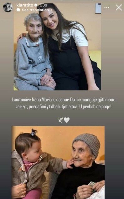 “Lamtumirë nana Maria e dashur. Do me mungoje gjithmonë zëri yt, përqafimi i yt dhe lutjet tua. U prehsh në paqe” ka shkruar ajo krahas njoftimit të bërë në rrjetet sociale.