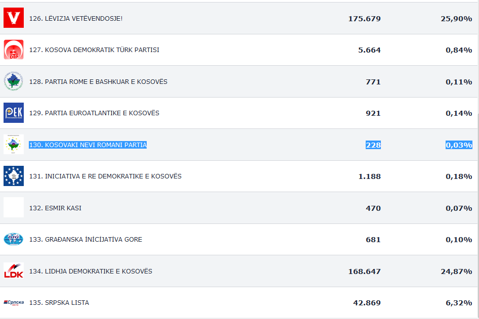 Është partia Kosovaki Nevi Romani e cila në këto zgjedhje sipas rezultateve të publikuara nga KQZ ka marr vetë, 228 vota. /ORAinfo/