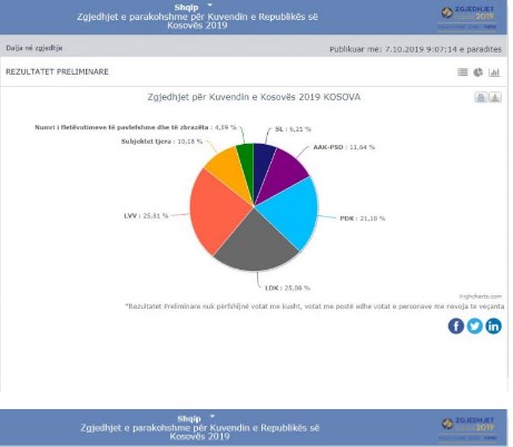 Deri më tani sipas rezultateve preliminare, e para është Lëvizja Vetëvendosje me 25,81%, e dyta Lidhja Demokratike e Kosovës me 25,05%, e treta Partia Demokratike e Kosovës me 21,19% dhe e katërta kolaicioni AAK-PSD me 11.61%.