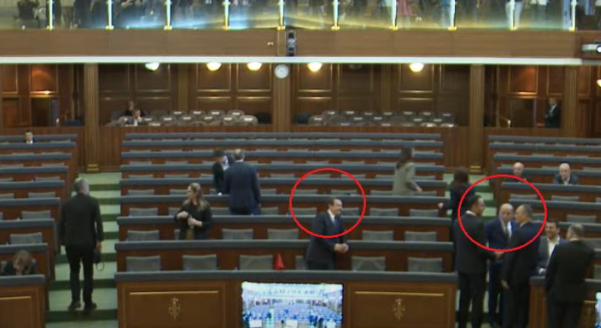 Në të njëjtën kohë, kryetari i Kuvendit, Glauk Konjufca, u ndal për një moment pranë ulëseve të Partisë Demokratike të Kosovës (PDK), ku përshëndeti disa prej deputetëve të kësaj partie.