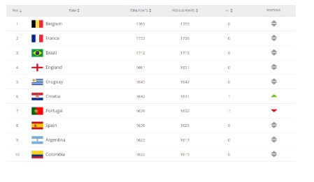 Dhjetëshja e kombëtareve të para mbetet e pandryshuar, me Belgjikën dhe Francën në dy pozitat e para.