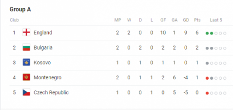 Në këtë grup, përveç Kosovës dhe Malit të Zi garojnë edhe Anglia, Republika Çeke dhe Bullgaria. Përderisa Kosova e ka zhvilluar vetëm një ndeshje deri më tani, Mali i Zi i ka zhvilluar dy. Por, përkundër kësaj, dy Kombëtaret kanë baras pikë të grumbulluara deri më tani, vetëm një.