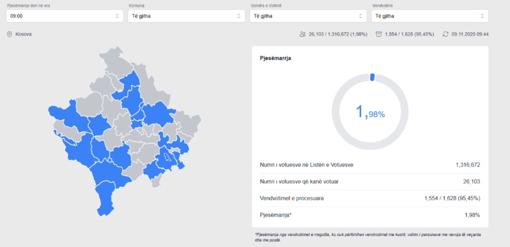 Sipas të dhënave të Komisionit Qendror Zgjedhor, deri në orën 9:44 minuta, numri i votuesve që kanë votuar është 26 mijë e 86 qytetarë.