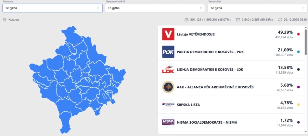 Komisioni Qendror i Zgjedhjeve ka përditësuar pak më parë të dhënat mbi rezultatet e zgjedhjeve të parakohshme parlamentare që u mbanë dje në Kosovë.