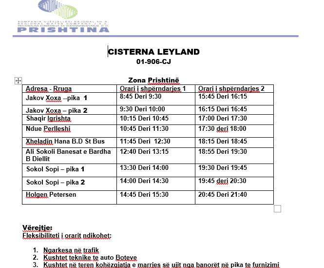 KRU “Prishtina” publikon orarin e autobotëve për furnizim me ujë për pije