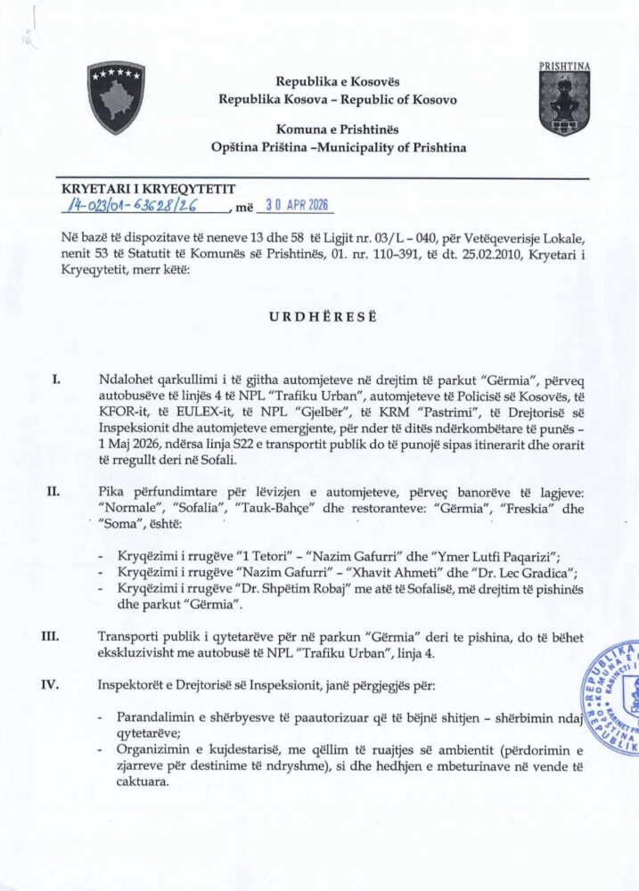 Komuna e Prishtinës ka njoftuar se nesër, me rastin e Ditës Ndërkombëtare të Punës, ndalohet qarkullimi i të gjitha automjeteve në drejtim të parkut “Gërmia”.
